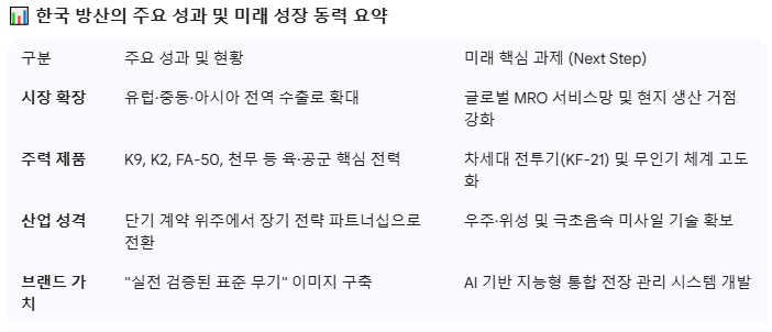 ## 종합 및 전망: 글로벌 방산 시장의 주류로 우뚝 선 대한민국