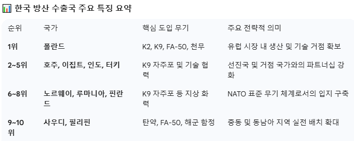 최근의 대규모 계약과 도입 실적을 바탕으로 정리한 한국 방산 수출국 TOP 10의 현황과 그 전략적 의미를 분석해 드립니다.